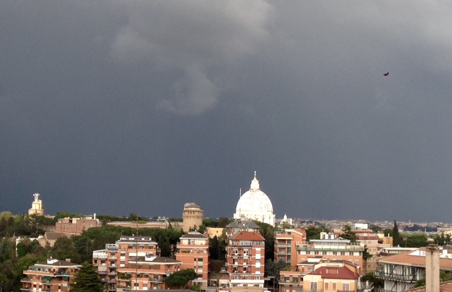 Dalla mia finestra vedo splendere la cupula di san Pietro, bianca come mai, sullo sfondo nero del maltempo.